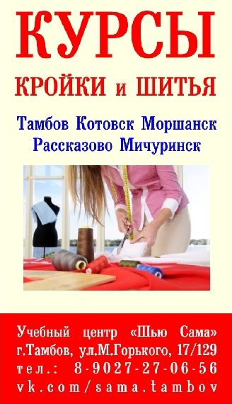 Учебному центру "Шью Сама" г. Тамбов требуется директор филиала, открываемого в . Мичуринск. УЦ "Шью Сама" предлагает пройти обучение крою и шитью, вязанию крючком и на спицах, а также посетить мастер-классы по рукоделию.