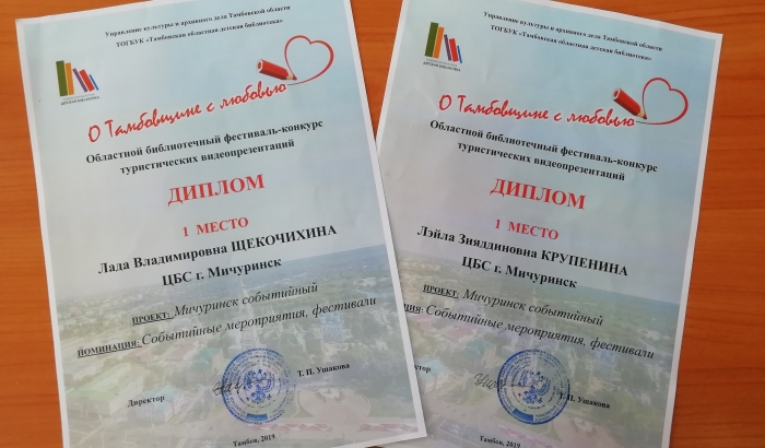 Подведены итоги областного библиотечного фестиваля-конкурса туристических видеопрезентаций «О Тамбовщине – с любовью!», организованного Управлением культуры и архивного дела Тамбовской области и Тамбовской областной детской библиотекой». Конкурс проводился по шести номинациям. Дипломом первой степени в номинации «Событийные мероприятия, фестивали» были награждены сотрудники краеведческого отдела Центральной городской библиотеки г. Мичуринска Лада Щекочихина и Лейла Крупенина за проект «Мичуринск событийный».