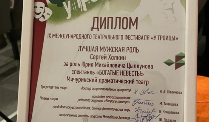 Наши актёры представили на суд жюри спектакль «Богатые невесты» (12+) (режиссёр - Николай Елесин). По итогам фестиваля диплом за лучшую мужскую роль присуждён актёру Мичуринского драматического театра Сергею Холкину, сыгравшему в постановке роль Цыплунова.
