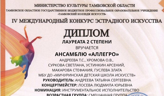 Ансамбль в составе: Суркова Светлана, Устинкин Арсений, Макарова Стефания, Гуслева Злата, преподаватели Андреева Татьяна Сергеевна, Хромова Оксана Викторовна, концертмейстер Лосева Людмила Юрьевна завоевали звание лауреата II степени.