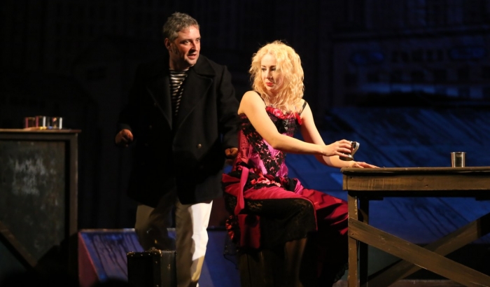 Премьера драмы-балета прошла 1 ноября на большой сцене в постановке приглашенного режиссера и хореографа Анны Фекеты. Спектакль получился необычным, очень эмоциональным, во многом благодаря молодым актерам. В постановке есть очень удачные работы молодежи, в первую очередь главных героев: актрисы Яны Бендерской и актера Сергея Холина. Сергей Холин с первой минуты 1 акта очень достоверен и интересен, Яне же Бендерской, на мой взгляд, в 1 акте немного не хватило пластики, что полностью компенсировалось во 2 акте спектакля, где балетные сцены были превосходно оправданы. Именно эти сцены создали напряжение, смысловую нагрузку и актерски необыкновенно хороши. Верх мастерства – это, конечно, сцена моряков и Анны Кристи. В том же ключе сцена драки и любовная сцена Анны Кристи и Мэтта Бэрка. Немного отвлек от сцены драки мерцающий свет, который, несомненно, должен был придать напряженности, но только мешал.