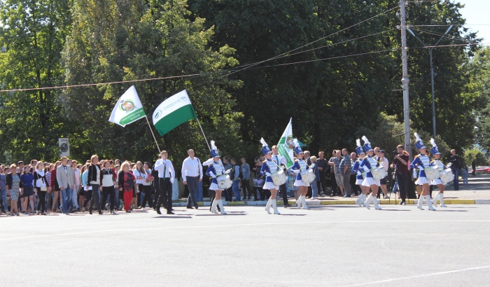 Чёткий ритм праздничному мероприятию задал ансамбль барабанщиц из Липецка: 7 очаровательных девушек возглавили шествие студентов и преподавателей от 1-го корпуса университета до памятника Мичурину.