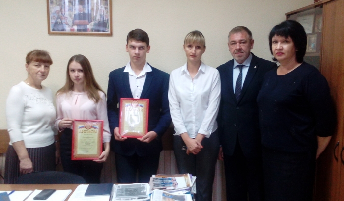 В администрации г.Мичуринска состоялось награждение мичуринских школьников, которые отличились в областной конкурсе детских рисунков и поделок «Охрана труда в творчестве юных тамбовчан». Заместитель главы администрации города Сергей Гридчин вручил дипломы воспитаннику станции юных техников Илье Кузьмину и ученице детской художественной школы им. А.М. Герасимова Анастасии Копыловой.