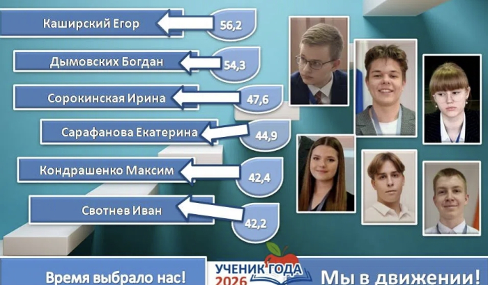 В Мичуринске в самом разгаре муниципальный конкурс "Ученик года-2026" (12+). После проведенных испытаний борьбу продолжают шестеро участников: Максим Кондрашенко - школы № 18 им. Героя Советского Союза Э.Д. Потапова, Иван Свотнев – МБОУ СОШ №1, Егор Каширский – МАОУ СОШ № 5 «Научно-технологический центр им.И.В.Мичурина», Екатерина Сарафанова – МБОУ СОШ № 15, Богдан Дымовских – МБОУ СОШ № 17 «Юнармеец», Ирина Сорокинская – МБОУ СОШ № 19. Финал состоится 22 апреля в ГДМ "Космос".