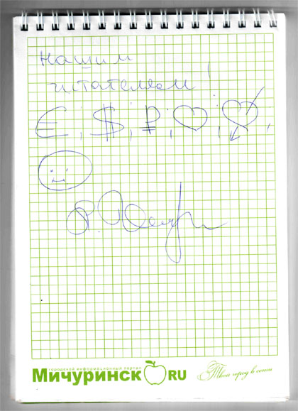 Для читателей нашего портала Любовь Шепилова оставила необычный графический автограф – обозначения евро, доллара, рубля, сердечки и смайлик. Что в её интерпретации означает: «Денег всяких и разных, любви, страсти и хорошего настроения!».