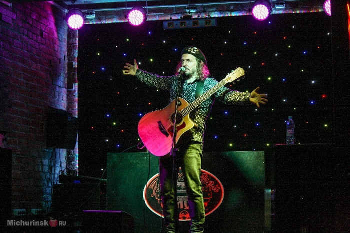 Хотя Михаил Башаков и приехал без заявленного в афише виртуоза губной гармошки Бориса Плотникова, на драйве концерта это никак не отразилось. Замечательный, техничный гитарист по-сути заменял собой целый оркестр и ещё умудрялся пританцовывать при этом. На сцене царил дух рок-н-ролла – корневой, озорной, глумливый, искренний. Радушно встретили зрители «Блюз о блюзе» и «Русский народный блюз» (последний почему-то напомнил о БГ). Традиционно жующие и пьющие зрители в этот раз больше были сосредоточенны на сцене, улыбались и бодро рукоплескали рок-исполнителю. Прозвучали и радио-хиты: кавер на песню Jefferson Airplane «Самбади», «Элис», «Не парься» (в оригинале хит Бобби Макферрина Don't Worry, Be Happy). «Элис» Башаков исполнил в самой полной версии, но, на мой взгляд, немного небрежно. На вопрос: «кто такая Элис?», Михаил ответил красивейшей песней «Богиня». Гастрольным будням он посвятил песню «Великий Устюг». Мичуринцы узнали о желании музыканта записать «русский альбом». Из «заготовок» к нему Башаков спел «Дитятко». Рассмешила до слёз его версия хита Pink Floyd «Another Brick In the Wall». Дождался я и исполнения своих любимых песен – «Солнце под крылом» и «Нам нужен просто светлый день». Во время исполнения песен гость из Санкт-Петербурга вставлял в серединку композиций оригинальные спичи, как, например, «хочу пожелать вам светиться изнутри для тех, кто рядом и для тех, кто далеко, но главное – безвозмездно!».