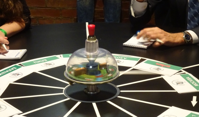 Третий по счёту вояж волчка вокруг стола предоставил возможность блеснуть знаниями Марине Шашловой. На картинке с дисковым телефоном она разглядела «кастет», своё наблюдение сопоставила с известным ей фактом и правильным ответом помогла команде заработать третье очко.