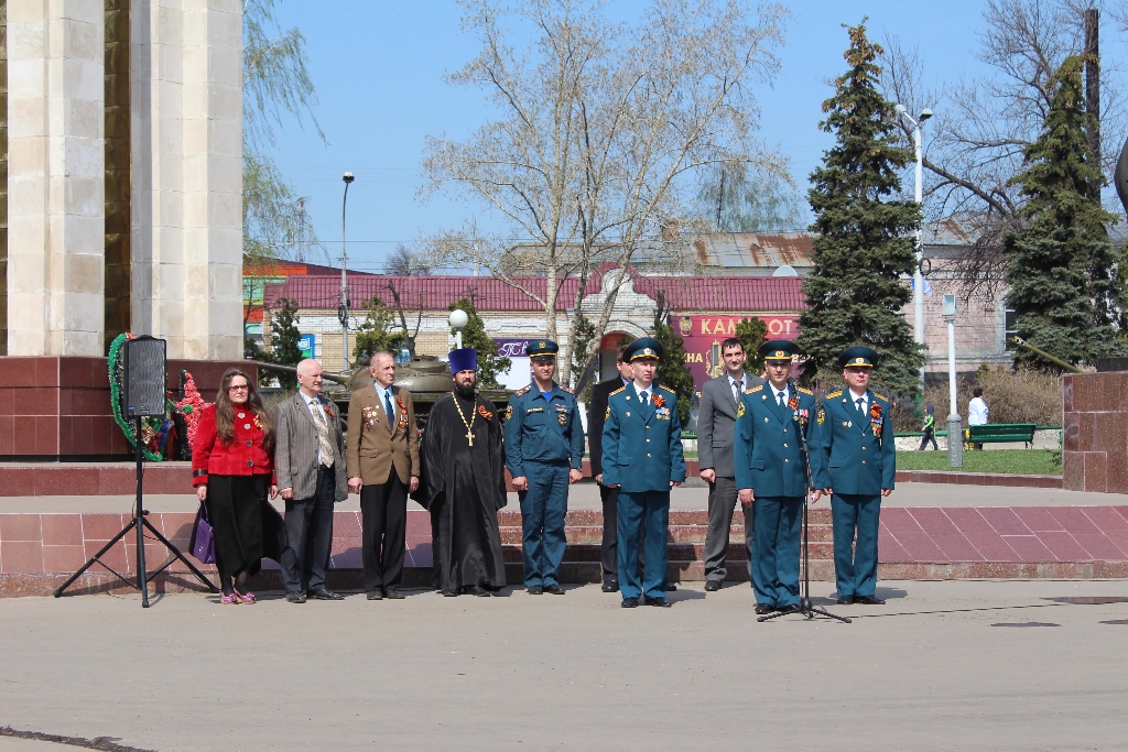 В Мичуринске Знамя Победы встречали на площади Славы: на торжественный митинг собрались представители Главного управления МЧС России по Тамбовской области, городской администрации, Мичуринской и Моршанской епархии, ветераны, студенты-железнодорожники.