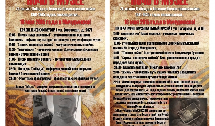 В мичуринском краеведческом музее в течение всего дня будет работать историко-документальная выставка о мичуринцах-участниках Великой Отечественной войны "Во имя Победы". В 18-00 работники музея ждут горожан на художественной выставке "Помнит мир спасённый", в 19-00 мичуринские поэты прочтут стихи о войне, в 19-30 в вечернем кинозале состоится демонстрация фильма "Горячий снег", в 21-00 посетителям представят литературно-музыкальную композицию "Песни помогали воевать", в 22-30 в рамках информационного часа работники музея расскажут о наградах Победы, "Ночь в музее" завершится демонстрацией фронтовых фотографий из фондов музея.