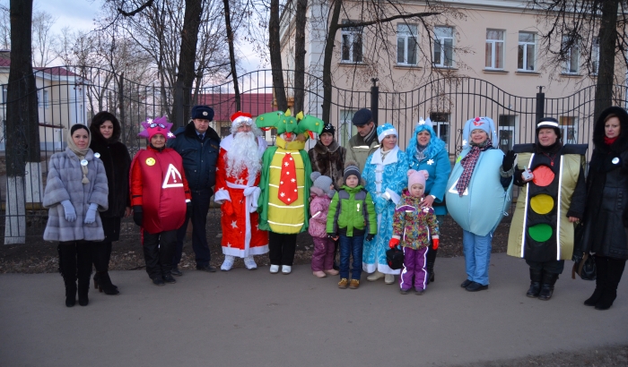 А затем, педагоги вместе с госавтоинспекторами вышли на оживлённый перекрёсток с лозунгом «Стань заметней в Новый год!». Дед Мороз, Снегурочка, Принцесса, Змей Горыныч, Крош и Ёжик, и конечно, Светофор, вручали пешеходам памятки, листовки по тематике дорожной безопасности. А самые маленькие участники дорожного движения с удовольствием разгадывали загадки о дорожных знаках и получали светоотражатели от Снегурочки, а сладкие угощения от Деда Мороза. Конечно, на всех костюмах сказочных героев были световозвращающие элементы. Фликеры, браслеты, значки, наклейки, светоотражающая тесьма не только не испортили внешний вид костюма, но и дополнили его. Посох Деда Мороза светился не хуже жезла инспектора ДПС, браслет Снегурочки был модным дополнением к костюму, а наклейки и фликеры на костюмах сказочных героев делали их более заметными! Акция получилась яркой и интересной, прохожие улыбались и благодарили, а водители приветствовали сказочных персонажей звуком клаксонов.