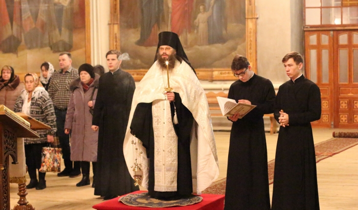 Его Преосвященству сослужили митрофорный протоиерей Анатолий Солопов, протоиерей Валерий Литвиненко, протоиерей Димитрий Малюкин, диакон Илия Бундзяк, диакон Игорь Теребинин и диакон Владислав Плаксин.После сугубой ектении Преосвященнейший Владыка вознес молитву о мире на Украине.