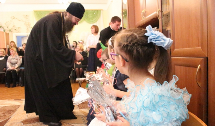 В завершении утренника епископ Гермоген поблагодарил ребят за их искреннее и проникновенное славление рожденного Спасителя и преподнес детям сладкие подарки и иконки.