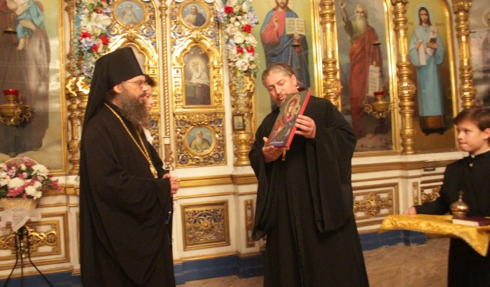 Отец Димитрий в ответном слове поблагодарил Архипастыря за совместную молитву и высокую награду. В свою очередь настоятель храма на молитвенную память преподнес епископу Гермогену икону Божией Матери, привезенную из Сирии, ладаницу и Библию на арабском языке.