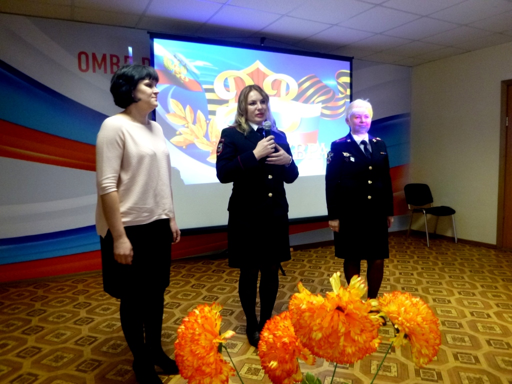 Заместитель председателя городского Совета депутатов Е.А. Золотарёва передала поздравления с наступающим праздником от главы города М.В. Харникова, председателя городского совета И.А. Платицына и от себя лично. Поздравили сотрудников мужчин и женщины–полицейские: начальник отделения по работе с личным составом подполковник внутренней службы И.В. Курочкина, заместитель начальника отдела дознания майора полиции М.Ф. Назарова, главный бухгалтер Хмырова Светлана Владимировна.