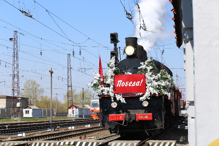 Во главе состава Победы – паровоз серии «Эм» (710-46) 1931 года выпуска. Паровоз по-настоящему легендарный – не только тем, что он на ходу, но и тем, что принимал непосредственное участие в событиях Великой Отечественной войны. Паровозный гудок как тревожное эхо страшной войны. Окутанный клубами пара состав замирает у перрона до 13 часов 40 минут. На платформах – военная техника: танк Т-34-85, мотоцикл М-72 с ручным пулеметом Дегтярёва и противотанковая пушка 1-К. Среди вагонов – вагон-музей, где можно узнать об участии железнодорожников в Великой Отечественной войне, осмотреть немногочисленные, но интересные экспонаты времён войны. Есть также вагоны-теплушки, дающие представление о суровом быте солдат и вагон для командного состава. Этот вагон-купе ранее служил дважды Герою Советского Союза маршалу Ивану Коневу. Сам паровоз празднично украшен цветочными гирляндами – ретро-вариант первых послевоенных месяцев, когда солдаты-победители начинали возвращаться на Родину.