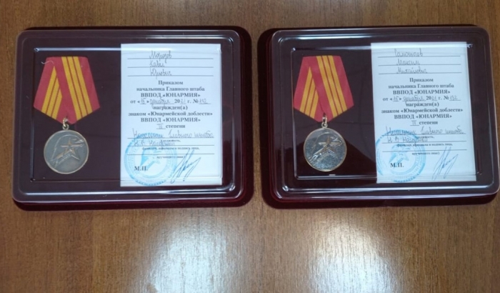 9 февраля в администрации города Мичуринска юнармейцев Павла Морозова и Максима Самотаева наградили знаком «Юнармейской доблести» (ВВПОД «Юнармия» третьей степени).