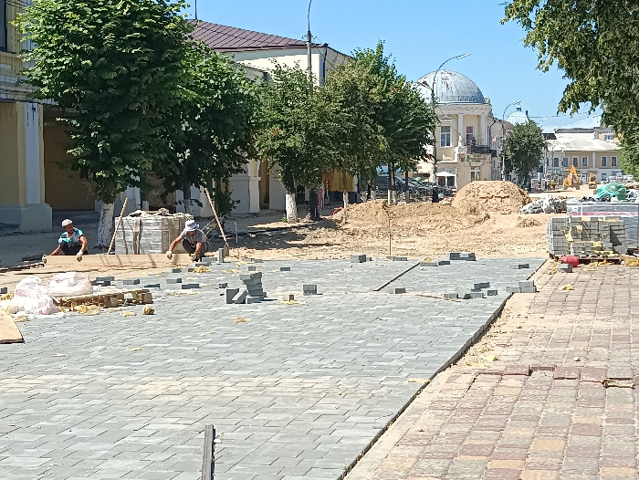 В этом году подрядная организация приступила ко второму этапу реализации проекта, который включает реконструкцию площади Ленина и участки улицы Советской вдоль центрального парка. Рабочие приступили к укладке плитки.