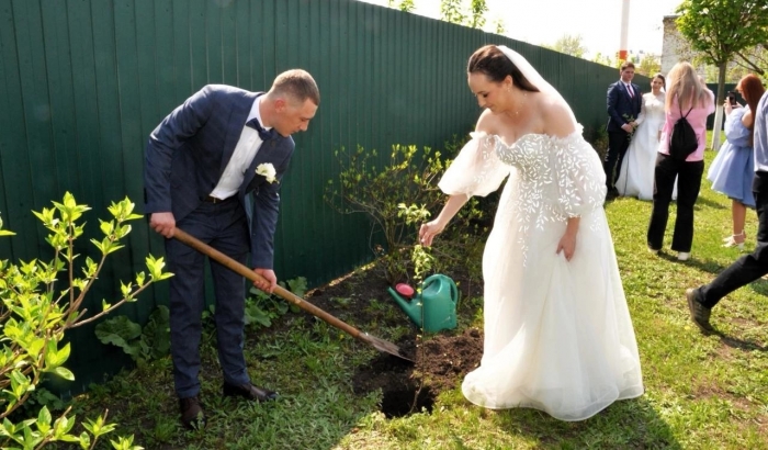 Молодоженов, сочетающихся узами брака, приглашали принять участие в посадке яблонь.