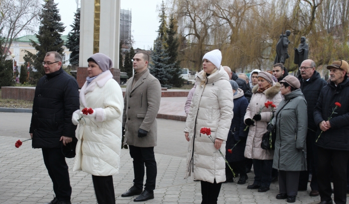 Руководство города, представители администрации, депутаты, ветераны, активисты возложили цветы к мемориалу на площади Славы.