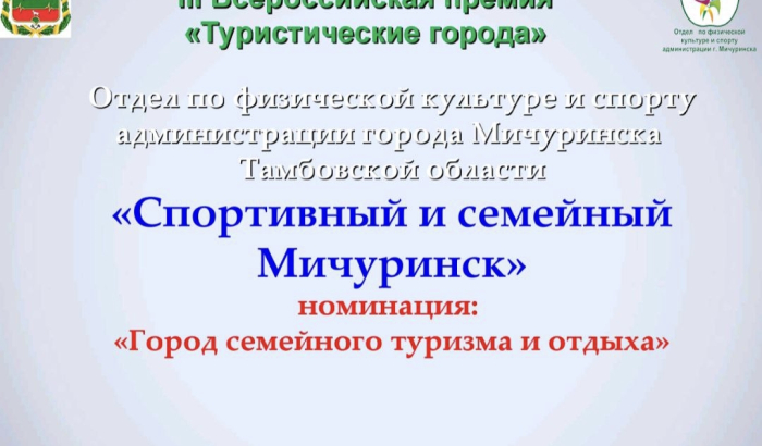 Проект отдела по физической культуре и спорту администрации города Мичуринска “Спортивный и семейный Мичуринск” вошёл в число финалистов III Всероссийской премии “Туристические города” (6+) в номинации “Город семейного туризма и отдыха”. Ранее этот проект также был отмечен в числе лучших муниципальных практик в сфере физической культуры и массового спорта.