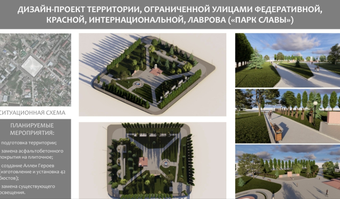 - Часть Парка культуры и отдыха. В планах: строительство амфитеатра для проведения мероприятий на свежем воздухе, озеленение территории, замена плитки и обновление освещения. установка малых архитектурных форм.