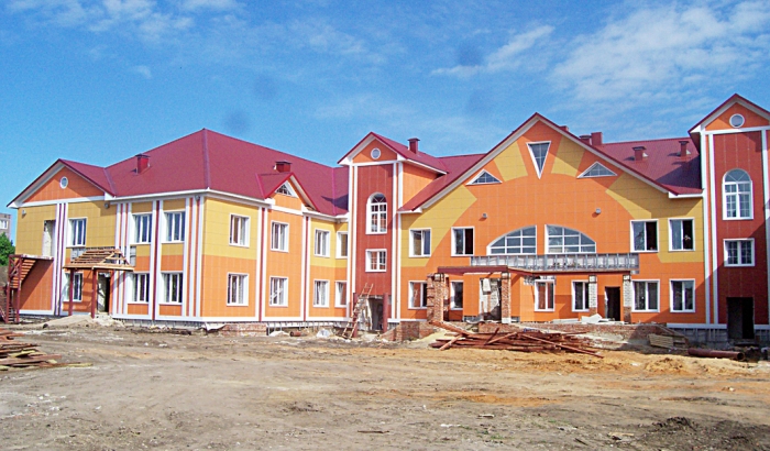 Двухэтажное здание со скатной крышей из металлопрофиля имеет 12 входов. В помещениях смонтированы все инженерные сети: отопление, водопровод, канализация, электроснабжение. Зимой тепло уже поступало на объект по временной схеме от уже действовавшей блочной газовой котельной, запланировано, что садик будет со временем иметь собственную котельную.