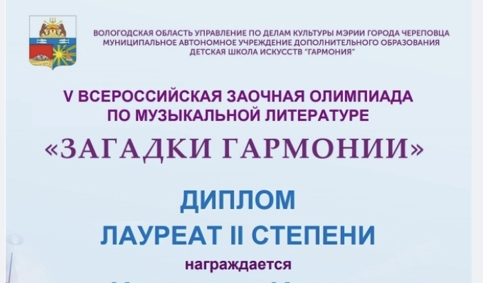В Череповце при поддержке БПОУ ВО «Череповецкое областное училище искусств и художественных ремёсел им. ВВ. Верещагина» прошла V Всероссийская олимпиада по музыкальной литературе «Загадки Гармонии» (6+).