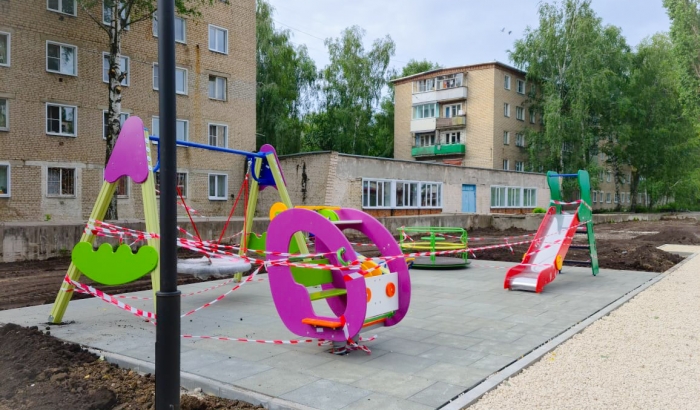 На улице Мира установили новую детскую площадку и приступили к асфальтированию