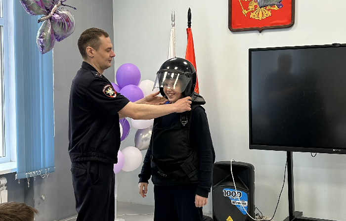 Командир отдельного взвода патрульно-постовой службы полиции старший лейтенант полиции Роман Уваров наглядно рассказал о спецсредствах, находящихся на вооружении органов внутренних дел. Примерить защитный шлем и бронежилет, захотели как мальчики, так и девочки.